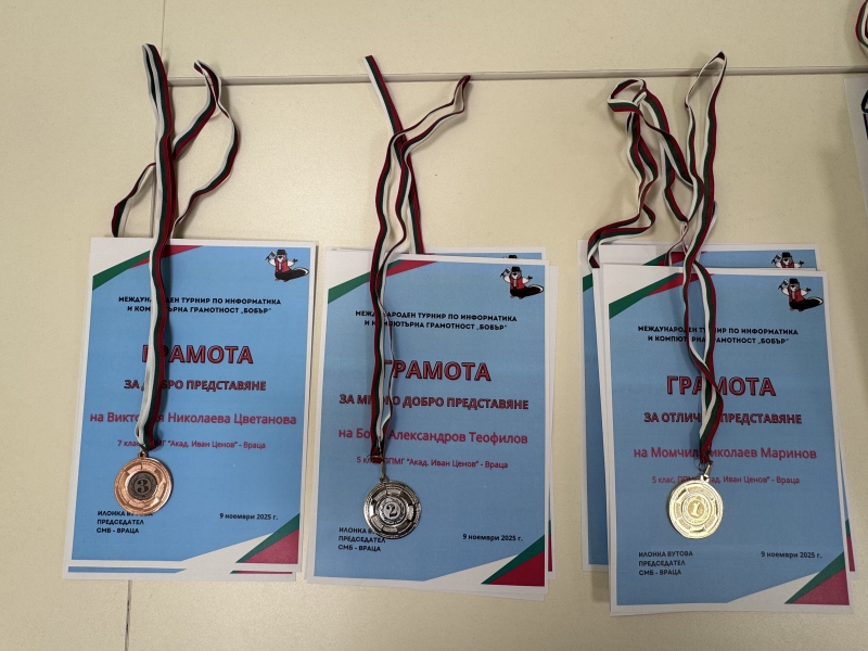 Наградиха най-добре представилите се ученици от ППМГ „Акад. Иван Ценов“ – Враца в XXXІV математически турнир „Черноризец Храбър“ и международното състезание по информатика и компютърна грамотност „Бобър“. Младите математици завоюваха общо 7 златни, 5 сребърни и 5 бронзови медала.