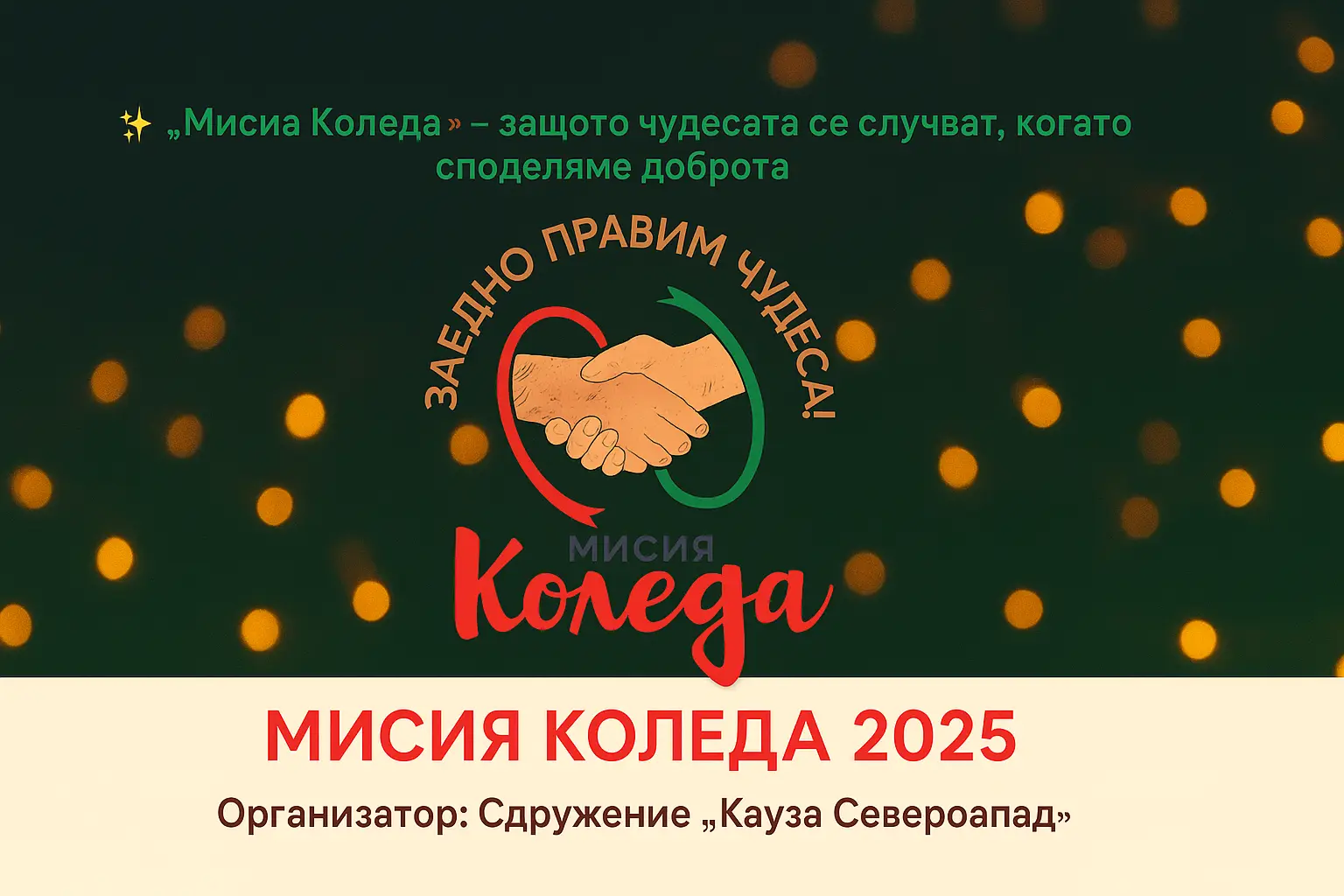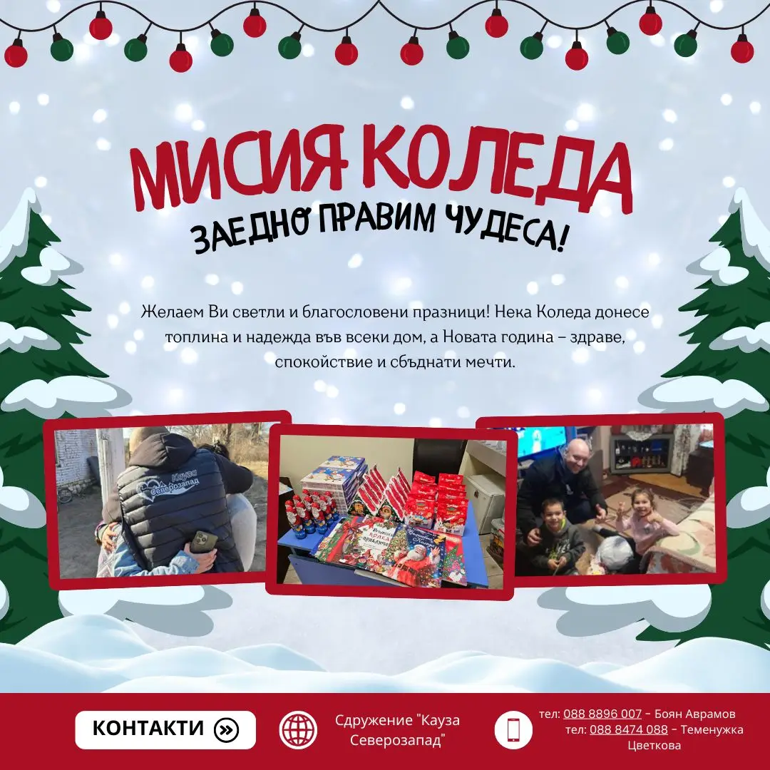 „В Северозападна България има десетки деца и възрастни, за които Коледа е просто още един ден. С „Мисия Коледа“ искаме да променим това – да им покажем, че добротата съществува и че никой не е забравен. Подаръкът е само поводът – истинското чудо е в споделената човечност. Не оставяйте тяхната Коледа да е тиха и тъмна. Подарите светлина. Подарете топлина. Заедно можем да напишем друга крачка на тази история. История, в която надеждата печели!“, пишат организаторите т „Кауза Северозапад“.