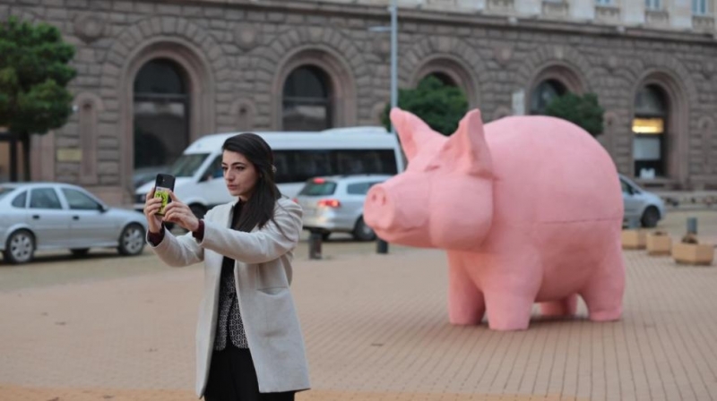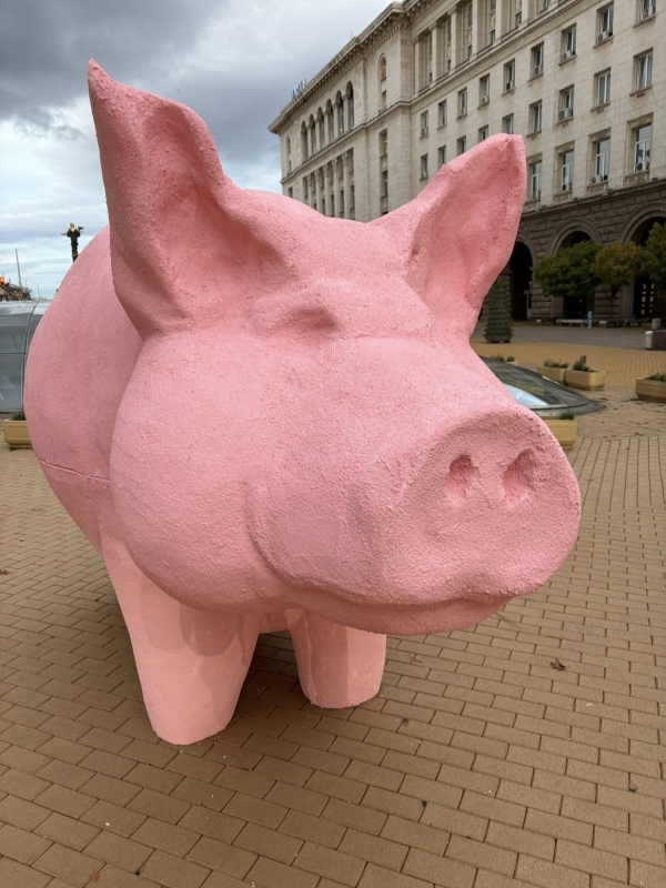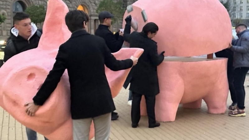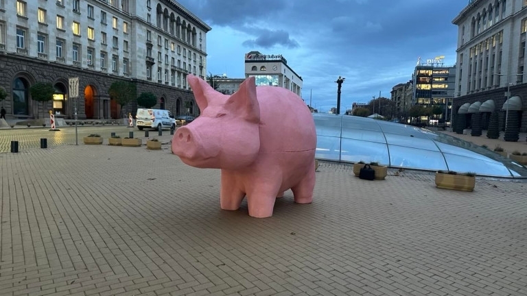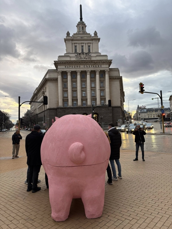 Активисти на "Продължаваме промяната" монтираха арт инсталация "Прасe-касичка" на площад "Независимост" пред централния вход на Народното събрание.