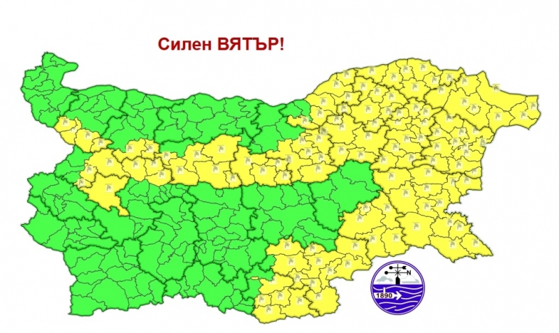 Предупреждението е в сила за Монтана и Враца. Освен тях, ще духа силно и в областите София, София-град, Ловеч, Габрово, Велико Търново, Търговище, Русе, Силистра, Разград, Добрич, Шумен, Варна, Бургас, Ямбол, Хасково и Кърджали.