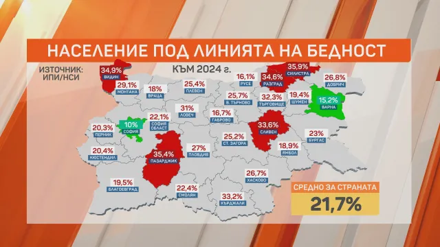 Видин, Разград и Сливен - тук средно около 35% са под прага на бедността.