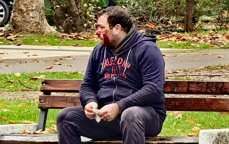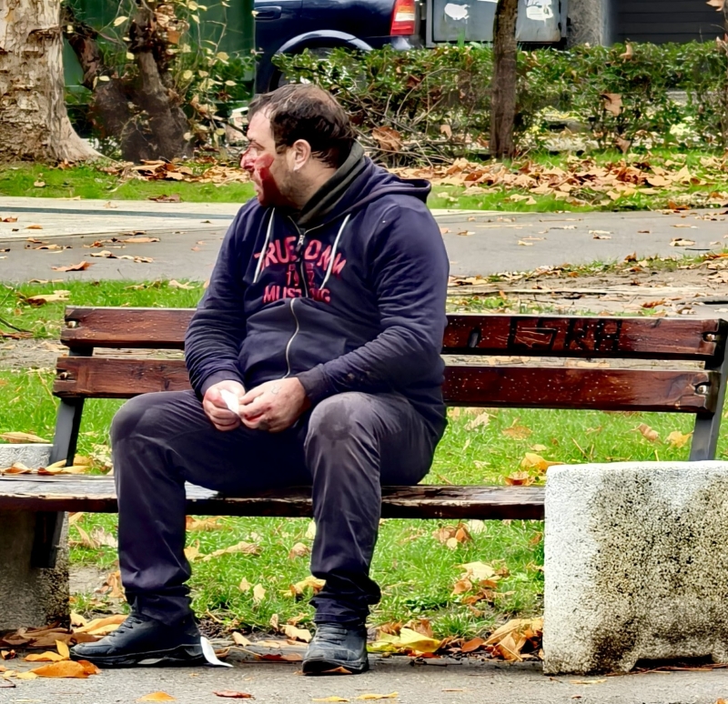 Междувременно, окървавеният мъж бил вдигнат и поставен на пейка в парка. От състоянието на връхните му дрехи става ясно, че е загубил много кръв.