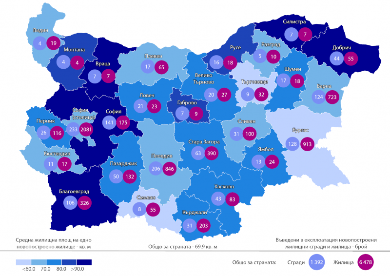 Средното жилище е с площ 69.9 кв. метра. Но има огромни разлики за страната. В София жилищата са най-просторни - средната площ е 139.9 кв. метра, а в областите Смолян и Търговище не достигат и 60 кв. метра. Прави впечатление, че след София се класира една крайдунавска област - Силистра, средната площ на новите домове е 121.7 кв. м. Както вече стана дума, това са седемте въведени в експлоатация къщи.