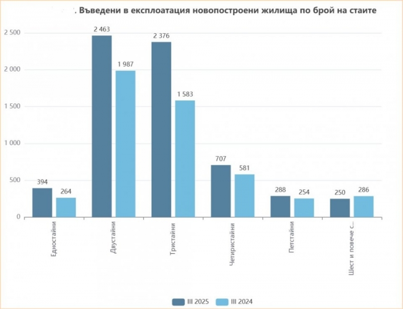 Междувременно през третото тримесечие на 2025 г. са започнати 1797 жилищни сгради с 6443 жилища, което представлява ръст от 15.7% на годишна база.