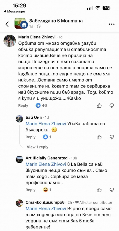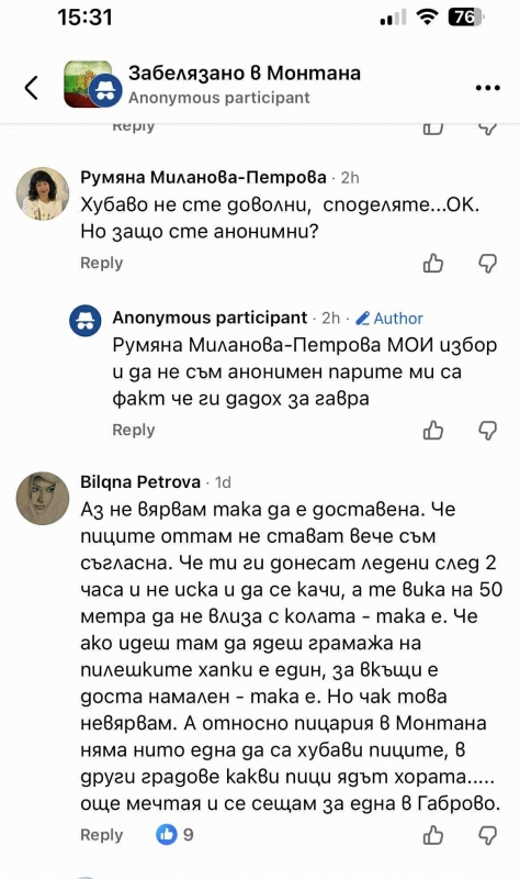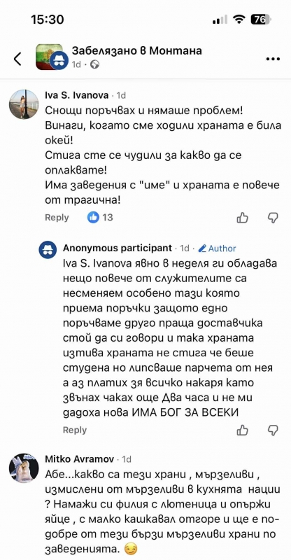 Коментарите под поста не закъсняха. Голяма част от пишещите са категорични, че отдавна „обслужването и храната там са под всякаква критика“. Други пък твърдят, че досега не са оставали разочаровани от въпросния обект. Някои дори се шегуват, че е възможно и куриерът, който е доставил пицата, да е бил гладен и да се е почерпил пътьом.