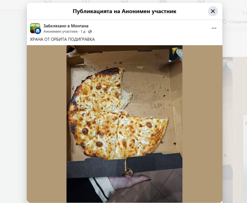 В социалните мрежи от няколко дни се върти пост, според който служителите на заведението са се подиграли с човек, поръчал храна за вкъщи. В неделя анонимен участник е качил снимка на пица в кутия. От кадъра се вижда, че липсва част от храната, а човекът, споделил поста, твърди, че тя е била доставена по този начин – с 2 липсващи парчета.