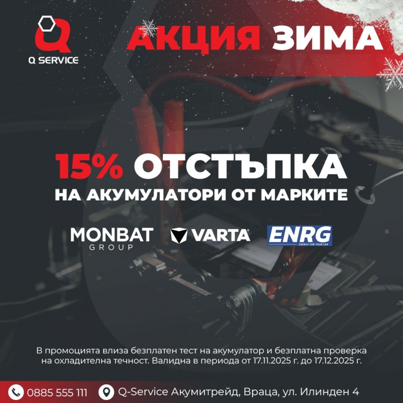 Q-Service Акумитрейд във Враца обявява три зимни промоции, валидни до 17 декември 2025 г.: