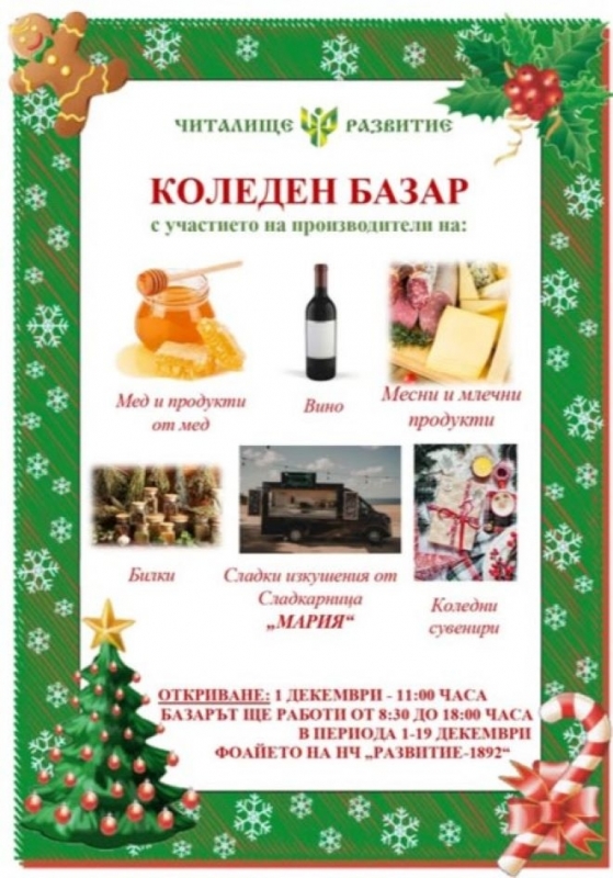 Коледният базар ще работи от 8.30 до 18.00 часа всеки ден от 1-ви до 12 декември във фоайето на читалището.