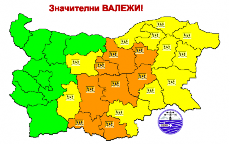 Оранжев код за значителни валежи обявиха от Националния институт по метеорология и хидрология (НИМХ) за областите Велико Търново, Търговище, Габрово, Пловдив, Стара Загора, Сливен, Смолян и Кърджали.