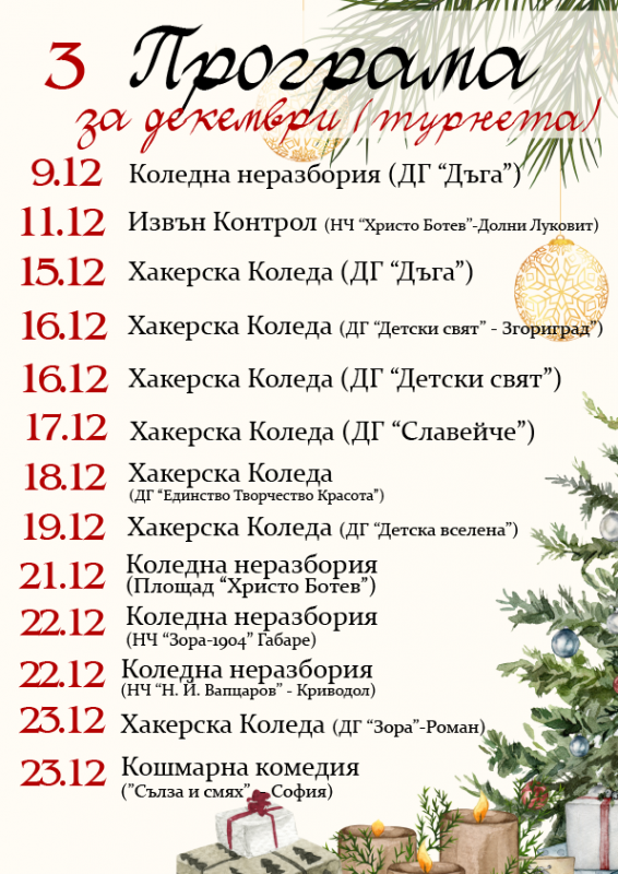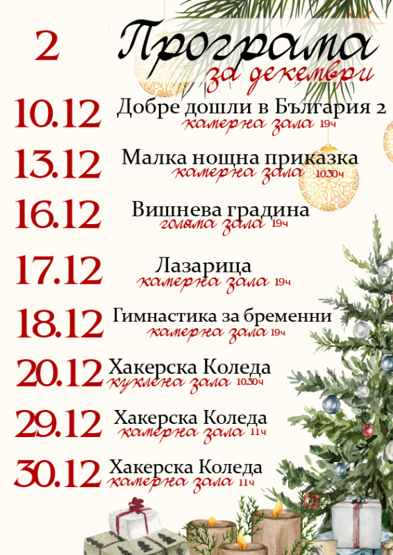 Годината завършва с финални представления на „Хакерска Коледа“ – на 29 и 30 декември в Камерна зала.