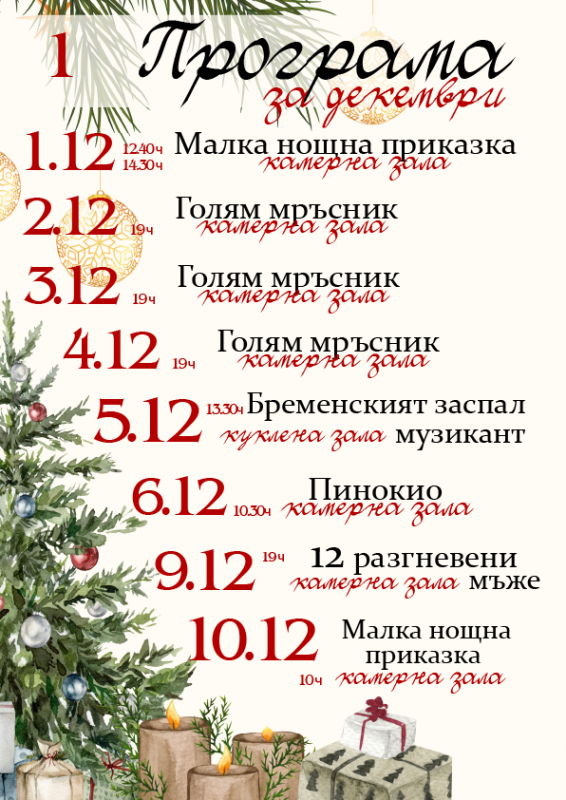 Сред акцентите за възрастни през декември са: „12 разгневени мъже“ от Реджиналд Роуз на 9 декември, „Добре дошли в България 2“ на 10 декември, „Лазарица“ от Йордан Радичков – 17 декември и „Гимнастика за бременни“ от Здрава Каменова на 18 декември.