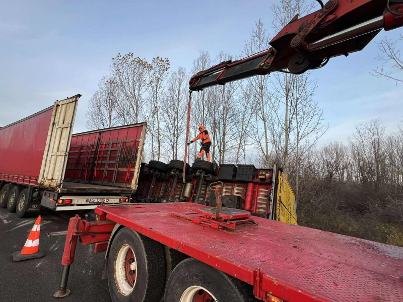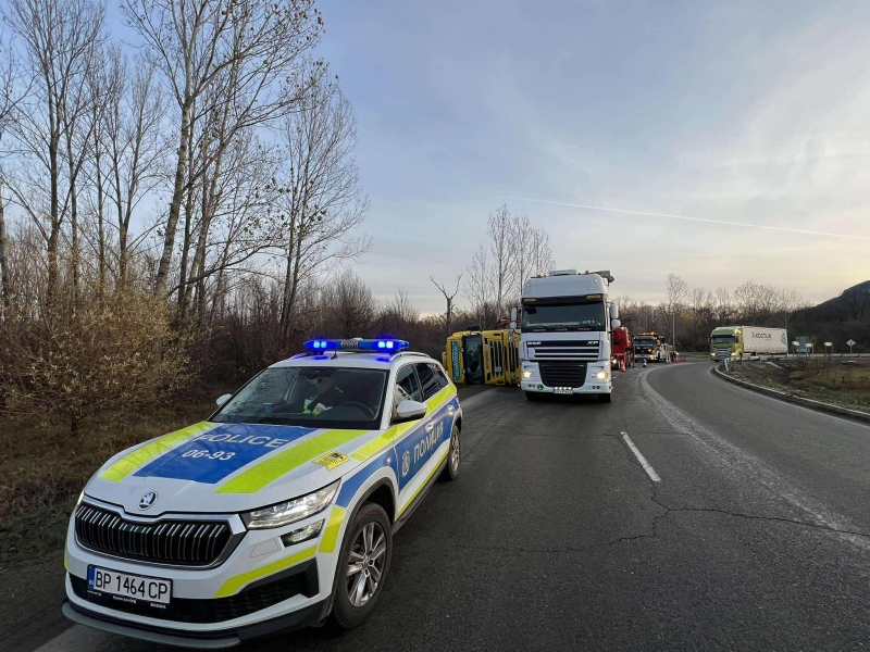 След произшествието на мястото са пристигнали 2 екипа на полицията и специализирана техника. В момента екипите разтоварват катастрофиралия камион, като след това той ще бъде изтеглен и преместен на безопасно място.