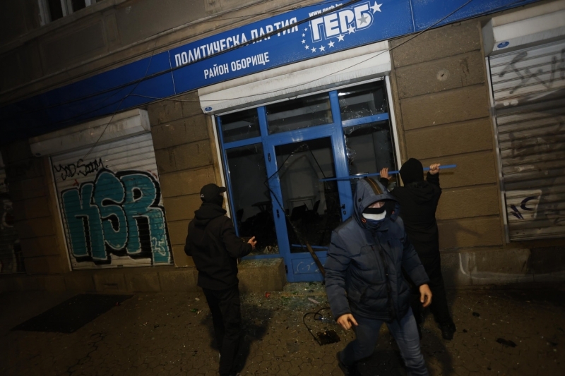 Парчета от счупени бутилки, пластмасови шишета, павета, използвани като оръжие и съборени кофи в резултат на погрома - това е гледката пред централата на "ДПС-Ново начало" в София във вторник сутрин. Витрините и вратите на сградата са изпочупени. Вандалите, облечени с черни дрехи и качулки, са хвърляли камъни и пиротехнически средства. Сред щетите, нанесени от тях, са счупени автомобили, запалени контейнери и столове. Мирно протестиращите се разграничиха ясно от тях.