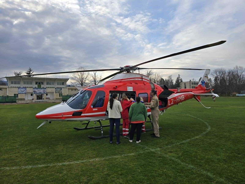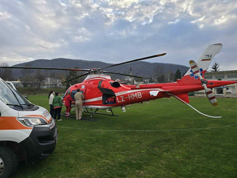 Преди минути хеликоптерът кацна на стадиона в градчето. Въздушната линейка вече тръгва към столицата и жената скоро ще бъде поета от специалисти в една от АГ-болниците.
