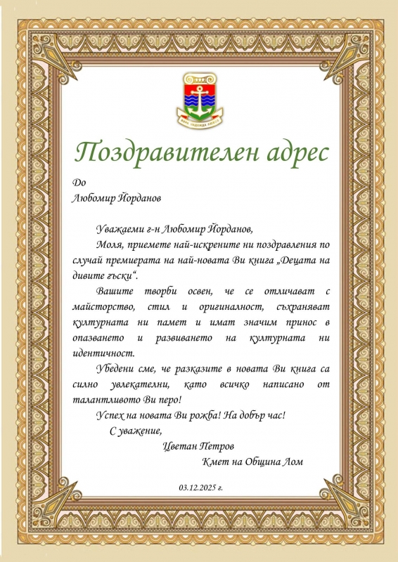 Поредна книга с разкази показа на бляскава премиера в София ломският журналист, поет и писател Любомир Йорданов. Новата творба на талантливия ни съгражданин се казва „Децата на дивите гъски“. Премиерата се състоя на 2 декември вечерта в книжарница „Гринуйч“ на столичния булевард „Витоша“. Книгата бе представена от именития ломски писател Емил Андреев. Събитието бе организирано от престижното издателство „ПАН“. В препълнената зала присъстваха много колеги, почитатели и приятели на уважавания автор, които изчакаха търпеливо реда си на дълга опашка за автограф. Писателят получи поздравителен адрес от кмета на Община Лом Цветан Петров.