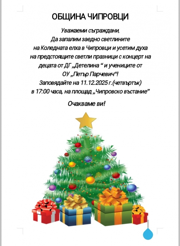 "Уважаеми съграждани, да запалим заедно светлините на коледната елха в Чипровци! Нека усетим духа на предстоящите светли празници с концерт на децата от детска градина "Детелина" и ученици от Основно училище "Петър Парчевич"!