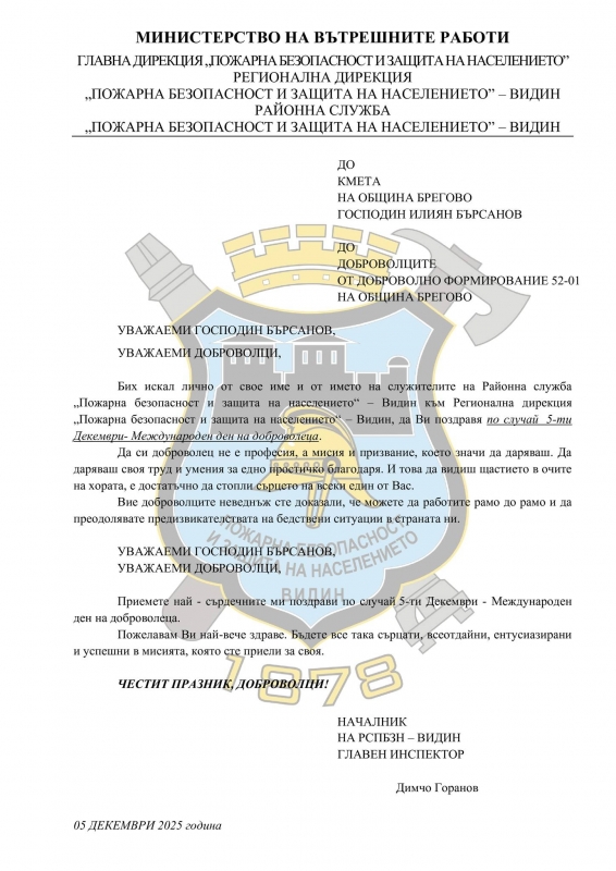 Главен инспектор Димчо Горанов благодари на 19 доброволци за усърдието, всеотдайността и приноса им в развитието на доброволчеството в региона. Грамотите бяха връчени по повод 5 декември - Международен ден на доброволеца.