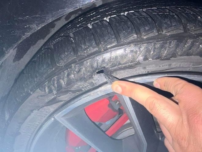 Някои от превозните средства са се отървали само със спукани гуми, докато други са със счупени джанти и дори щети по предните брони.