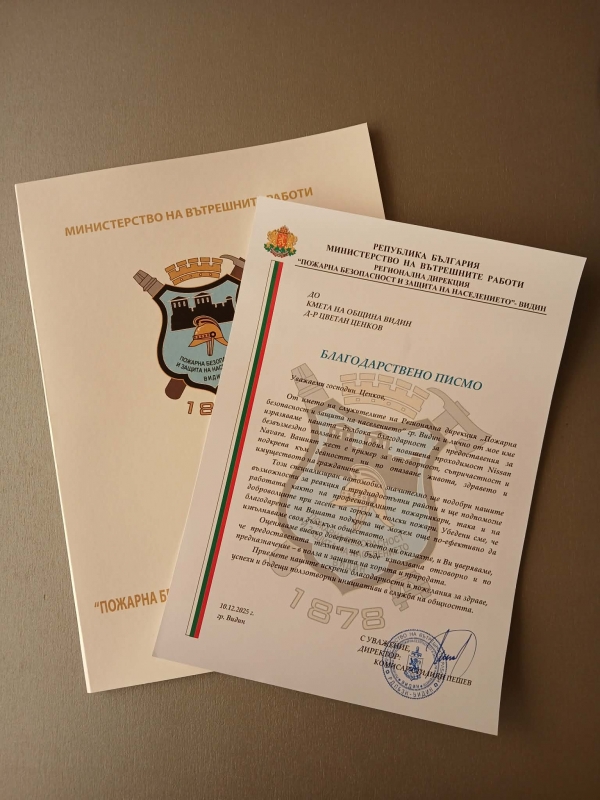 Регионалната служба „Пожарна безопасност и защита на населението“ във Видин получи нов автомобил „Нисан Навара“. Ключовете бяха предадени на директора на РДПБЗН комисар Стилиян Пешев. Джипът е с висока проходимост и е оборудван с 300-литров резервоар за вода. Той е закупен за нуждите на доброволното формирование, което се състои от 19 човека, и гасаческата група, която наброява 7 човека, и е предназначен за борба с горските пожари в труднодостъпни пресечени местности.