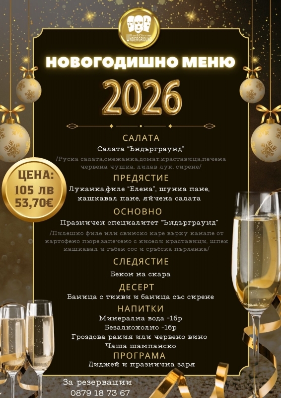 В най-празничния месец от годината, в „Underground Bar&Dinner“ все още има свободни дати за коледни банкети. Стяга се и парти в новогодишната нощ, като собствениците са подготвили богато меню и интересна програма.
