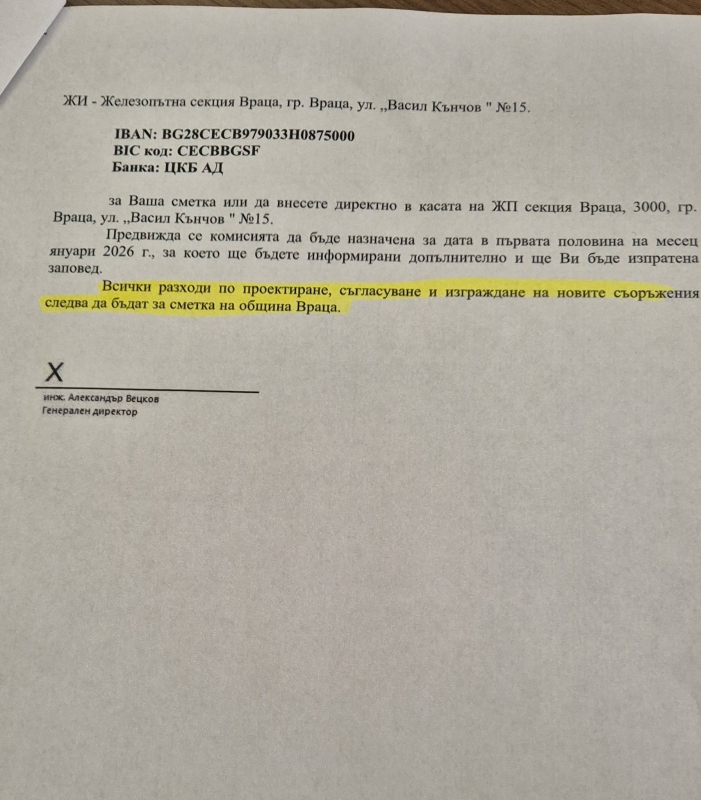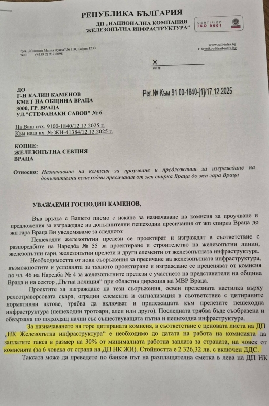 "Необходимостта от нови съоръжения за пресичане на железопътната инфраструктура се преценява от комисия по чл. 46 на Наредба 4 за железопътните прелези. Тя се съставя от представители на ДПНКЖИ, Пътна полиция и Община Враца."