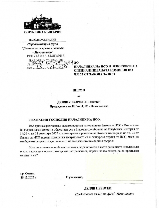 Лидерът на ДПС и ПГ на ДПС-НОВО НАЧАЛО Делян Пеевски изпрати писмо до началника на НСО и Специализираната комисия по чл. 23 от Закона за НСО, съобщиха от пресцентъра на партията.