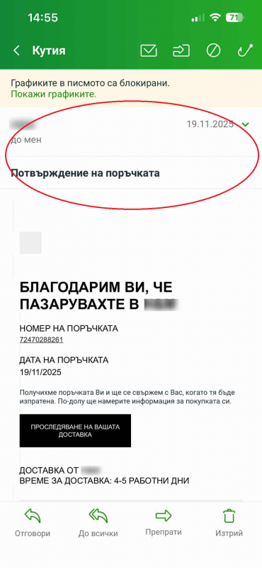 Наша редовна читателка – М.Д. си поръчала рокля от сайт за дрехи на 19 ноември. Според условията на фирмата, както и предвид предишни поръчки от там, доставката трябвало да се извърши в рамките на максимум 5 работни дни. За съжаление обаче жената така и не получила поръчаното и до днес.