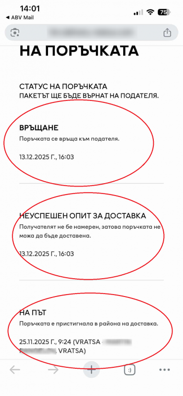 При разговора било изяснено, че поръчката е била приета веднага на 19 ноември, като на 25-и вече е била във Враца. Момичето в слушалката пояснило на врачанката, че според системата, куриер на „Еконт“ е върнал обратно към подателя въпросната пратка в 16.03 часа на 13 декември /което е почти месец по-късно/.