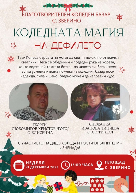 Благотворителен коледен базар в подкрепа на болни хора организират в мездренското село Зверино.