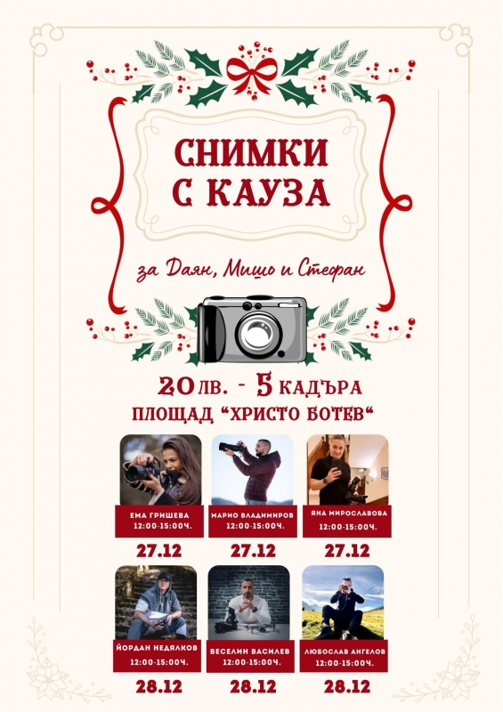 Срещу дарение от 20 лв. всеки човек ще получи 5 професионални кадъра, а 100% от събраните средства ще бъдат дарени за благотворителните каузи на Община Враца в подкрепа на Стефан, малкия Мишо и 3-годишния Деян в тяхната битка.