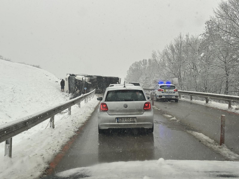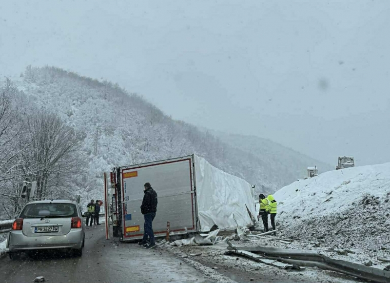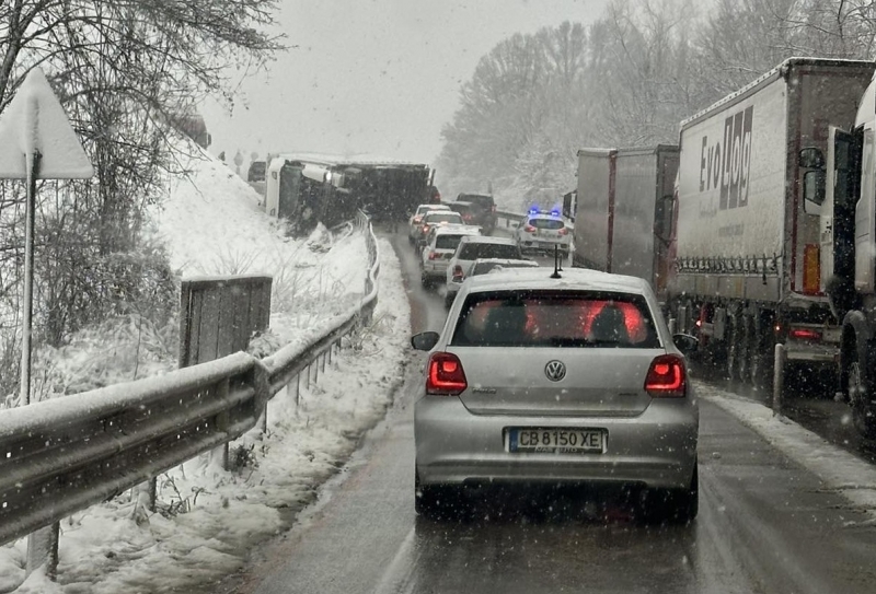 Извънредно! ТИР се обърна и затвори скоростния път Мездра-Ботевград, образуват се огромни тапи /снимки/