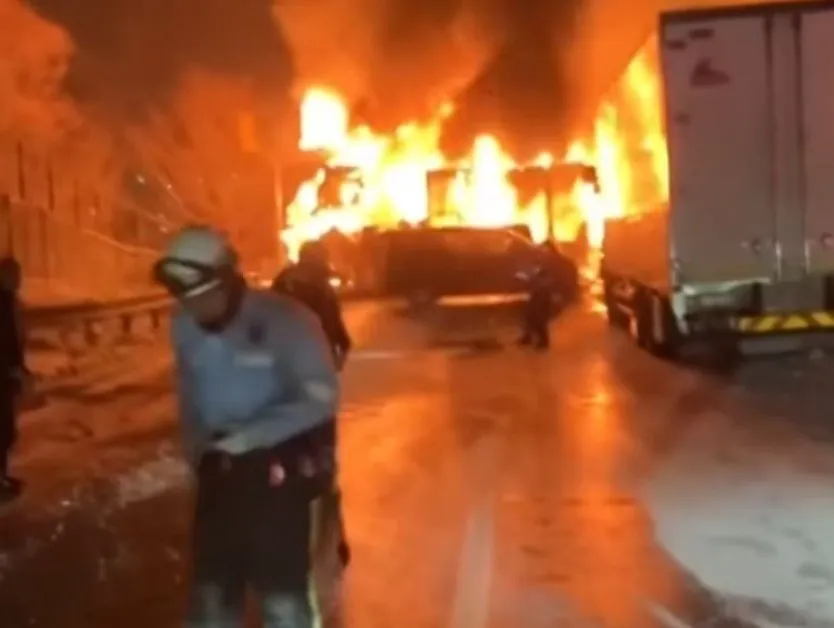 В периферията на сблъскалите се автомобили е избухнал пожар, който е обхванал над десет превозни средства, някои от които са напълно изгорели. Никой не е пострадал в пожара, който е бил изгасен около седем часа по-късно, заяви полицията.