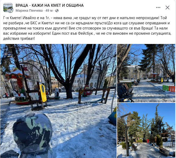 "Г-н Кмете! Ивайло е на 1г. - няма вина ,че градът му от пет дни е напълно непроходим! Той не разбира, че БКС и кметът ни не са си мръднали пръста! Докога ще слушаме оправдания и прехвърляне на токата към другите? Вие сте отговорен за случващото се във Враца! Та нали вас избрахме на изборите! Един пост във фейсбук, че не сте виновен не променя ситуацията, действия трябват!", написа в групата "Враца - кажи на кмет и община" Марина Пенчева и това сякаш обобщава мнението на хората за ситуацията в областния център.