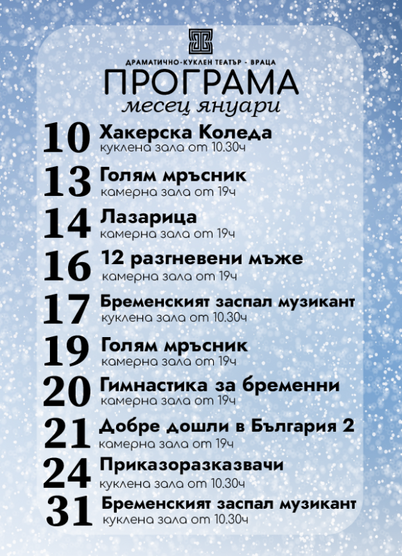 Специално място в януарската програма заемат и детските спектакли. Куклената сцена ще посрещне най-малките зрители с представленията: „Хакерска Коледа“ и „Бременският заспал музикант“ по Братя Грим. По традиция съботните детски представления продължават да бъдат специална среща за децата и гостите на Враца, като създават уютен и весел театрален уикенд.
