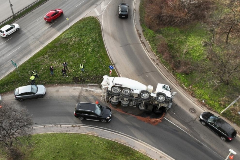 Бетоновоз се обърна на разклона на бул. „Пейо К. Яворов“ за бул. „Цариградско шосе“ в София. Инцидентът е станал във вторник сутринта.