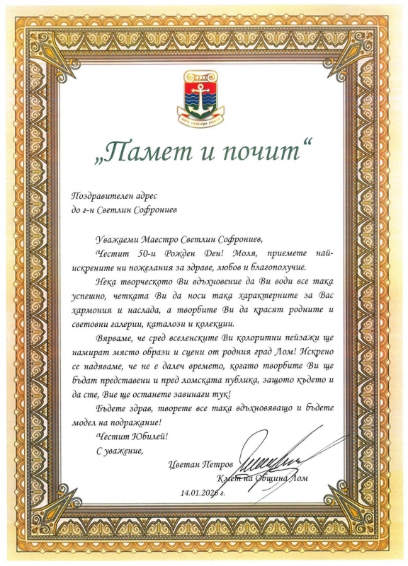 Община Лом почете с поздравителен адрес видния художник-акварелист от Лом Светлин Софрониев по повод неговия 50-годишен юбилей. Маестро Софрониев е един от най-добрите съвременни художници. Акварелите му се отличават със своя колорит и реализъм и се радват на изключителен интерес в страната и чужбина.