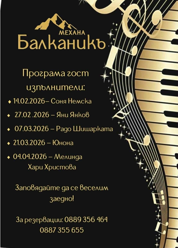 0889 356 464 и 0887 355 655! Запазете маса за своя личен повод, приятелско събиране или пък абитуриентски бал. И побързайте, защото в механа „Балканикъ“ забавлението е гарантирано!