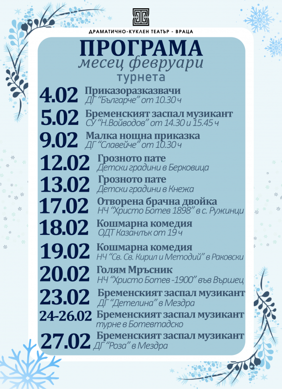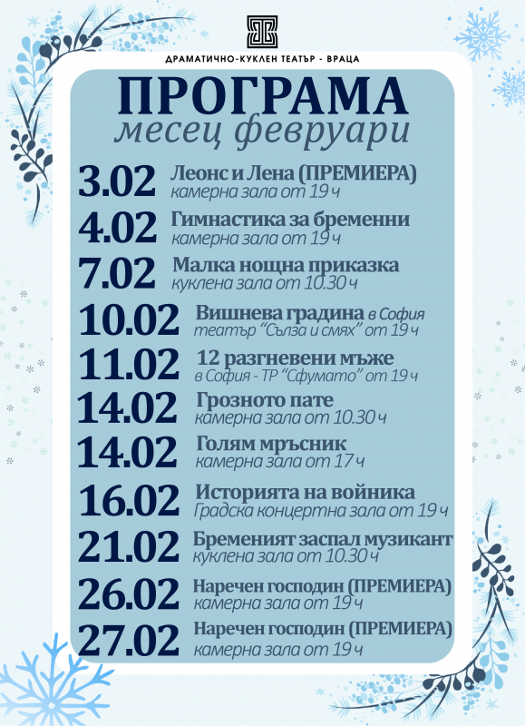 Месец февруари в Драматично-куклен театър–Враца започва и завършва с премиери, а между тях публиката я очаква богата, пъстра и динамична програма от спектакли за възрастни и деца, гостувания и специални събития.