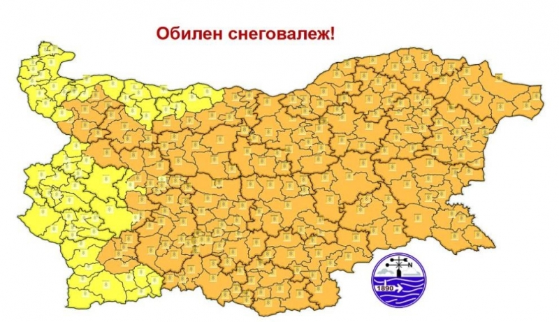 Синоптиците предупреждават за опасно време втора степен и наистина обилен снеговалеж - оранжев код е в сила за почти цяла България, с изключение на