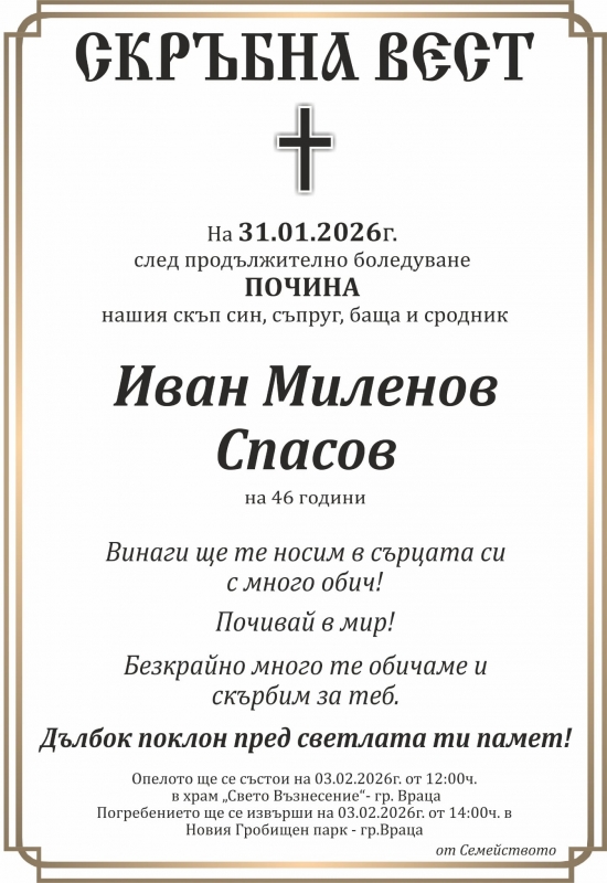 Близки, приятели и колеги на Спасов ще го изпратят в последния му път утре – 3 февруари. Опелото ще се състои от 12 часа в храм „Свето Възнесение“-Враца, а погребението – в 14 часа в Новия гробищен парк в областния град.
