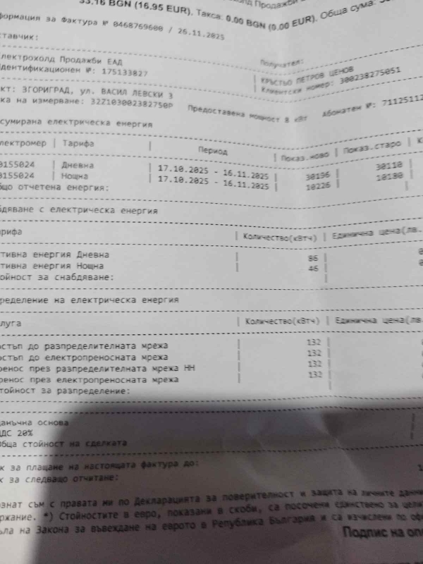 На изпратените от нея платежни ясно се вижда, как за периода от 17 октомври 2025 г. до 11 ноември 2025 г. жената е заплатила сумата от 16.95 евро или 33.16 лева. За същия период на новата 2026 г. обаче сумата е нараснала двойно. От 17 декември до 16 януари 2026 г. възрастната госпожа е заплатила 77.53 евро или 151.64 лева.
