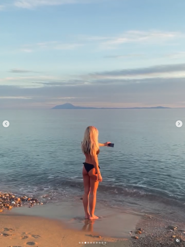 На първия кадър Мария позира край морския бряг под яркото слънце, а на втория – със залеза зад гърба си, сякаш току-що излязла от романтичен филм, заснет на екзотичен остров.
