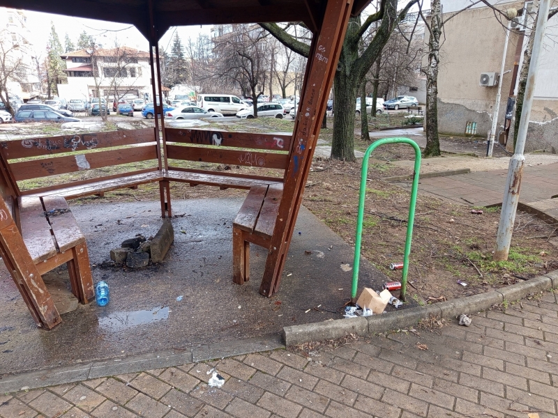 Втрещените живущи в квартала споделиха снимки, на които ясно се вижда как при беседка има следи от палене на огън, а отстрани до нея липсва кошчето за боклук.