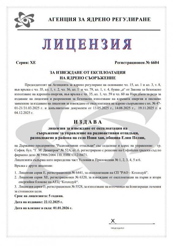 за извеждане от експлоатация в страната. Документът е в сила от 1 януари 2026 г. за срок от пет години и определя изискванията за безопасност при извеждане от експлоатация на Постоянното хранилище за радиоактивни отпадъци край с. Нови хан, община Елин Пелин.