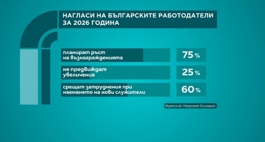 Ще има ли увеличение на заплатите през 2026 година? Ново изследване на компания за управление на човешки ресурси разкрива нагласите на българските работодатели. 75% планират ръст на възнагражденията, а останалите 25% не предвиждат увеличения. 60% пък срещат затруднения при наемането на нови служители. За тези тенденции и за кои сектори важат те говори Пламен Макавеев, който е изпълнителен директор на компания за управление на човешки ресурси, провел изследването, в ефира на „Твоят ден” по NOVA NEWS.