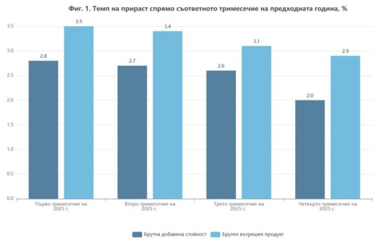 През четвъртото тримесечие на 2025 г. БВП се увеличава с 2.9% спрямо четвъртото тримесечие на предходната година. Брутната добавена стойност нараства с 2.0% по сезонно изгладени данни.