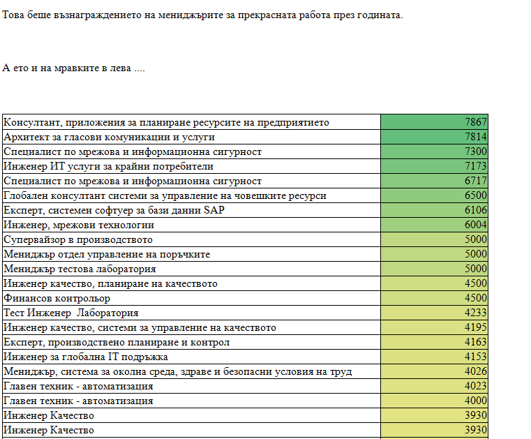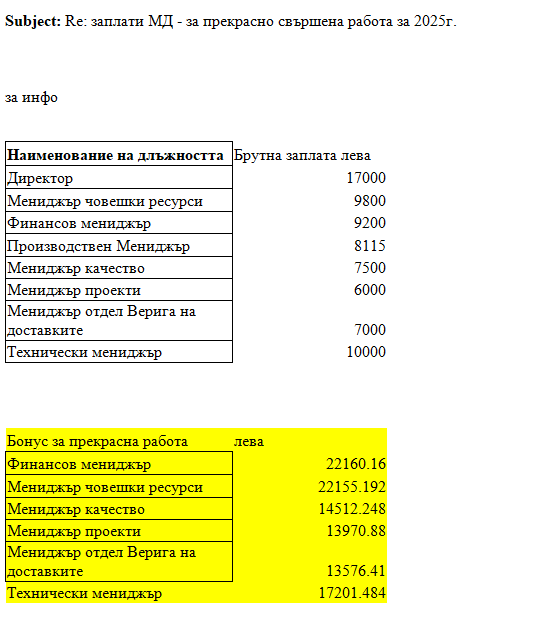 Ето и какви са били допълнителни парични облаги, които са разпределени между по-висшестоящите в замиращото предприятие: финансовият мениджър е получил 22 160 лв. Мениджърът човешки ресурси е прибрал 22 155 лв. Техническият мениджър се е зарадвал на допълнителните 17 201 лв. към заплатата си. Бонусът за мениджър качество пък е 14 512 лв. Мениджърът по проектите е гушнал 13 970 лв., а мениджърът на отдел Верига на доставките грижливо е скътал 13 576 лв.