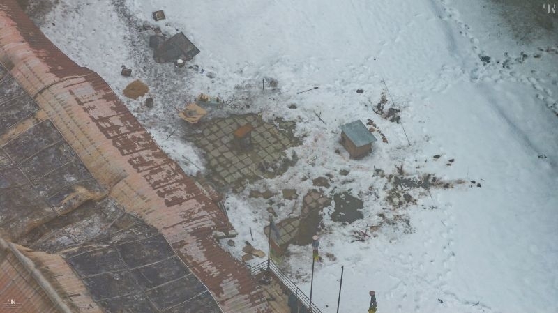 Стопеният сняг между колибата и хижата напомня очертанията на човешко тяло. Встрани от колибата и зад нея снегът също е стопен.