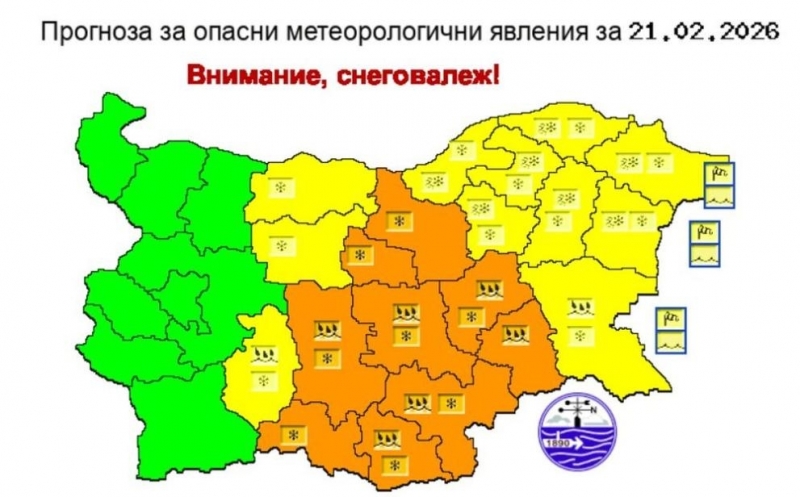 Жълт код за опасно време е в сила за 13 области. Значителни валежи от дъжд, ще преминават в сняг. В планинските райони ще има условия за виелици и навявания. На много места има опасност и от поледици. По Черноморието ще силен вятър с пориви 14-17 m/s. Жълтия код е в сила за областите Добрич, Варна, Бургас, Силистра, Разград, Шумен, Търговище, Русе, Плевен, Ловеч и Пазарджик.