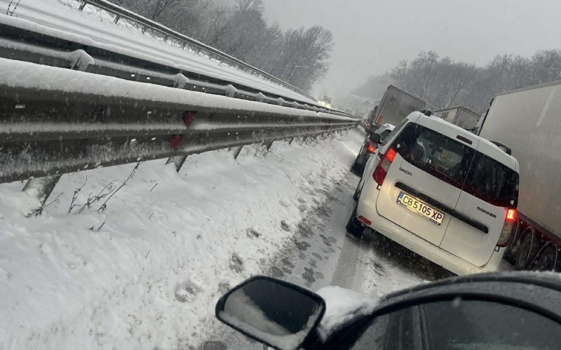 Около 2 часа скоростния път е блокиран и към момента опашките от превозни средства са километрични.